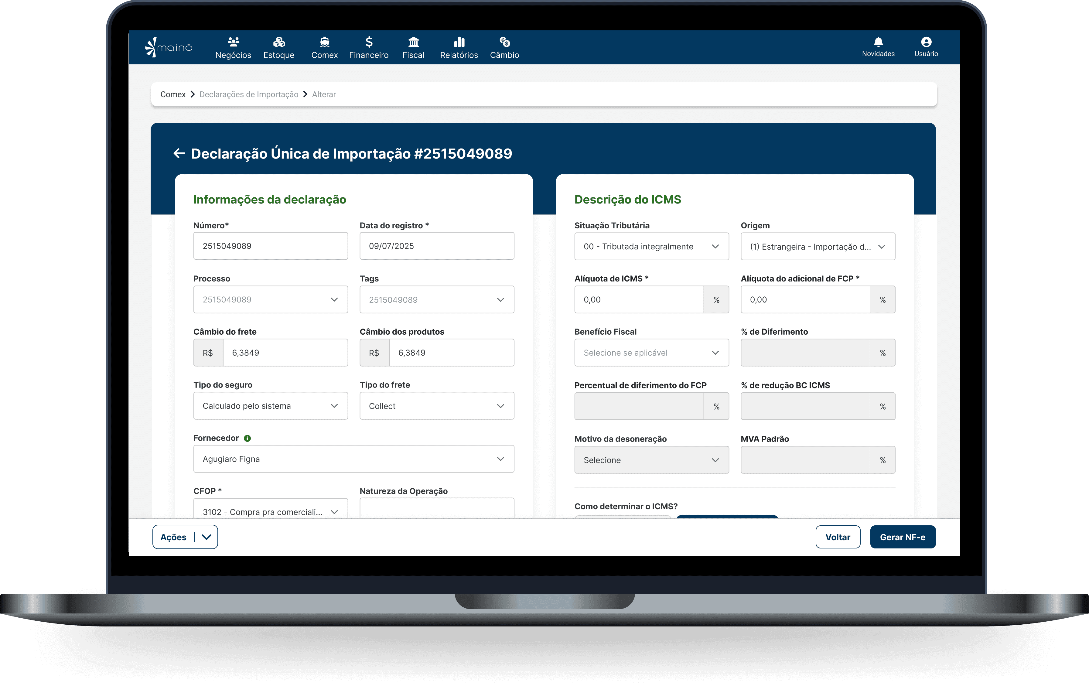 A Mainô já opera com os novos campos e cálculos exigidos pela Reforma, permitindo a emissão da Nota Fiscal de Importação no padrão atualizado, com mais segurança e menos risco de erro.